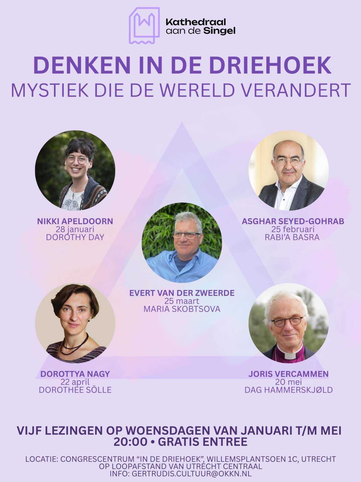 ‘Denken in de Driehoek’ is weer terug dit jaar. Van januari t/m mei zijn er in Utrecht maandelijkse algemene lezingen rondom het nieuwe thema: ‘Mystiek …