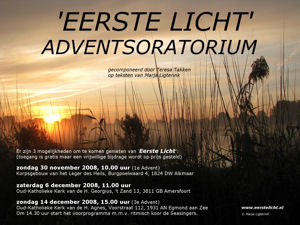 De bekende feesten Kerstmis, Pasen en Pinksteren hebben in de muziek en in de kerken prachtige liederen en oratoria opgeleverd. Alleen de Adventsperiode lijkt hierin een donkere stilte. Slechts een enkel Adventsoratorium is geschreven en dan alleen nog in het buitenland. Teresa Takken, bekend van onder andere de muziek die zij schreef voor Stichting Nieuw Liedfonds en het Savitri-opus, heeft hierin voorzien door een Adventsoratorium te componeren, ‘Eerste Licht‘ genaamd. ‘Eerste Licht‘ is geschreven op teksten van Marja Ligterink en wordt uitgevoerd door het projectkoor ‘Eerste Licht‘ en een voor dit doel samengesteld gelegenheidsorkest.