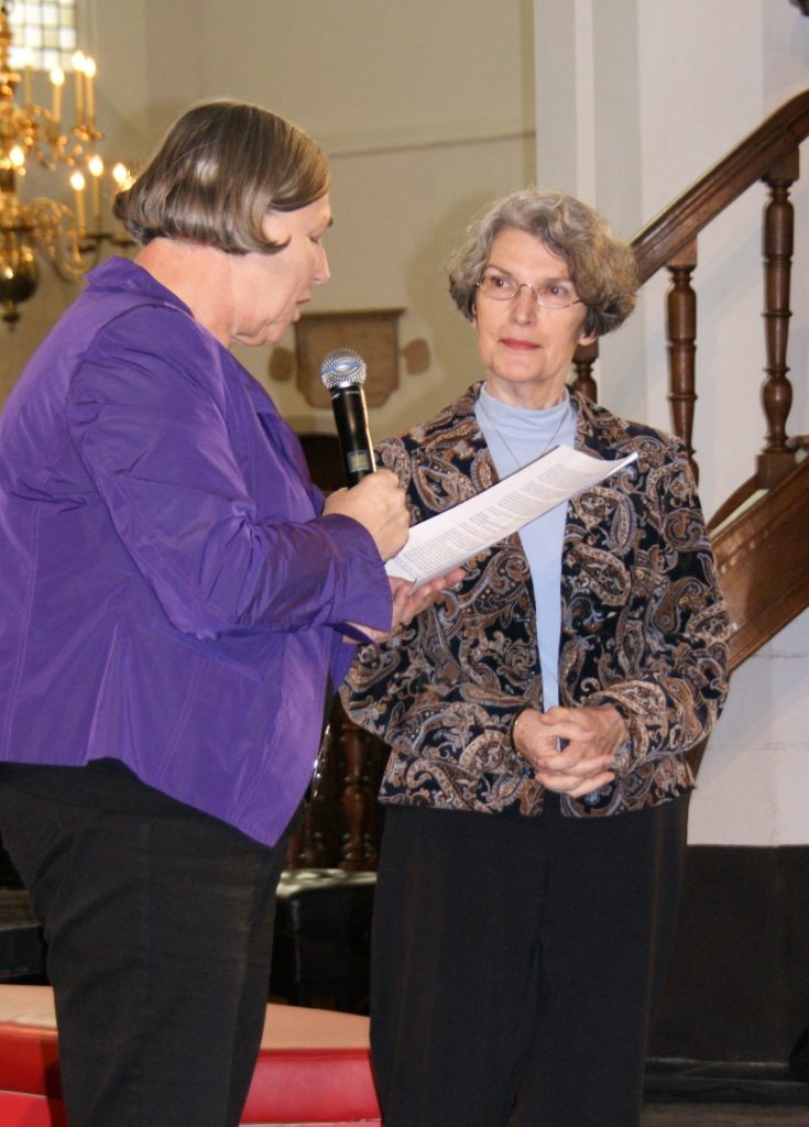 Mw. H.H. de Haan-Verduyn las als voorzitter van de jury het juryrapport voor, waarna de voorzitter van de Interkerkelijke Commissie Geldwerving, de heer D.Bijl de onderscheiding in de vorm van een beeldje uitreikte.