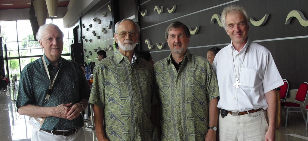 Foto: Huib van Beek (met baard) en Larry Miller (zijn opvolger). Links: Dr. Robert Gribben, van de World Methodist Council en lid van het Global Christian Forum comitee