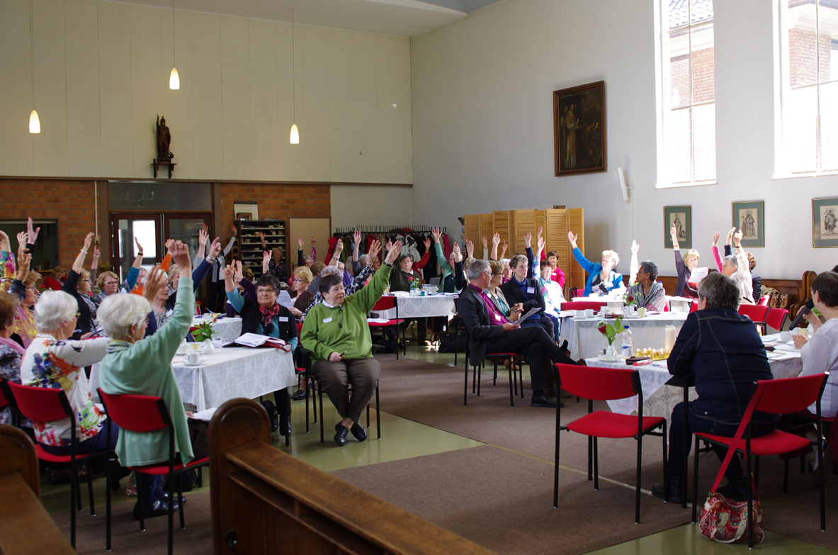 Alkmaar 13 mei 2014: een belangrijke datum in de geschiedenis van de Bond van O.K. Vrouwen in Nederland. Zoals in eerdere berichten al was gemeld, was het Bondsbestuur tot de slotsom gekomen dat de bestaande organisatie van de Bond niet meer van toepassing was in het huidig tijdsgewricht, waarin de leden vergrijzen. Anderzijds onderstreept een aantal goed bezochte initiatieven, dat het vrouwenwerk nog lang niet dood is. Om te zorgen dat er enige vorm van organisatie blijft bestaan, stelde het Bondsbestuur voor de Bond om te vormen naar een stichting met als naam: “Oud-Katholieke Vrouwen In Beweging.”