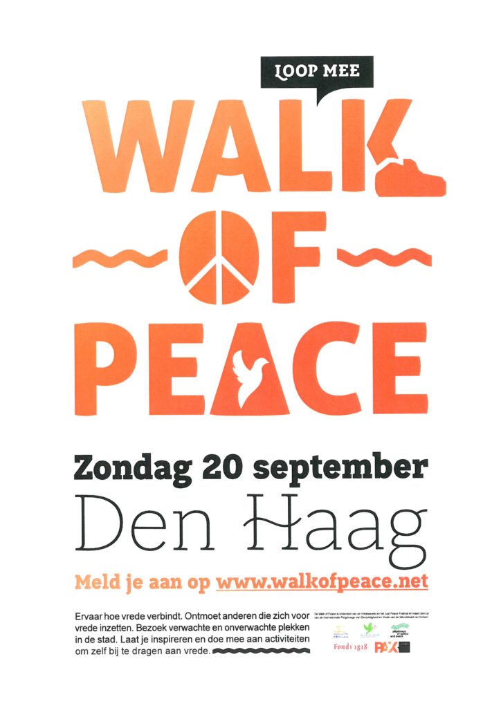 Op initiatief van de Raad van Kerken en Pax wordt in het kader van de Pelgrimage van Gerechtigheid en Vrede een vredeswandeling georganiseerd door de stad van recht en vrede – Den Haag. De wandeling vint plaats op zondag 20 september – in de Vredesweek.